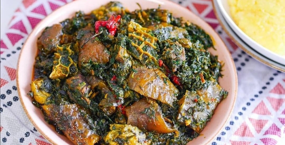 Nous avons également le Eru. Il s'agit d'un plat très festif et succulent. C'est une spécialité du peuple Banyang, originaire du département de la Manyu dans la région du Sud-Ouest du Cameroun. L'ensemble des ingrédients est souvent difficile à trouver hors du pays. Il s'agit d'une soupe de légumes composée de feuilles d'okok finement râpées, et mijotées avec des feuilles d'eau ou des épinards, communément appelées "water leaf", de l'huile de palme, des écrevisses, du poisson fumé, de la peau de vache (localement appelé kanda) ou de bœuf. Ce plat est traditionnellement consommé avec du foufou ou du gari.